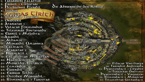 Wir sind in Minas Tirith noch lange lange nicht durch. Nun müsst ihr hier erneut diverse Stellen aufsuchen. Denn nun dist die Ahnenreihe der Könige dran. Unten auf meiner Karte sind alle Orte eingezeichnet wo ihr hin müsst. Damit ihr dann hoffentlich bald mit der suche in Minas Tirith fertig seid.