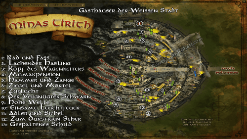 Die Gasthäuser der Weißen Stadt findest du allesamt in Minas Tirith, unten auf meiner Karte sind die Bereiche Markiert wo du hin musst. Suche diese einfach auf und du hast diese Tat in der Regel sehr schnell abgeschlossen.