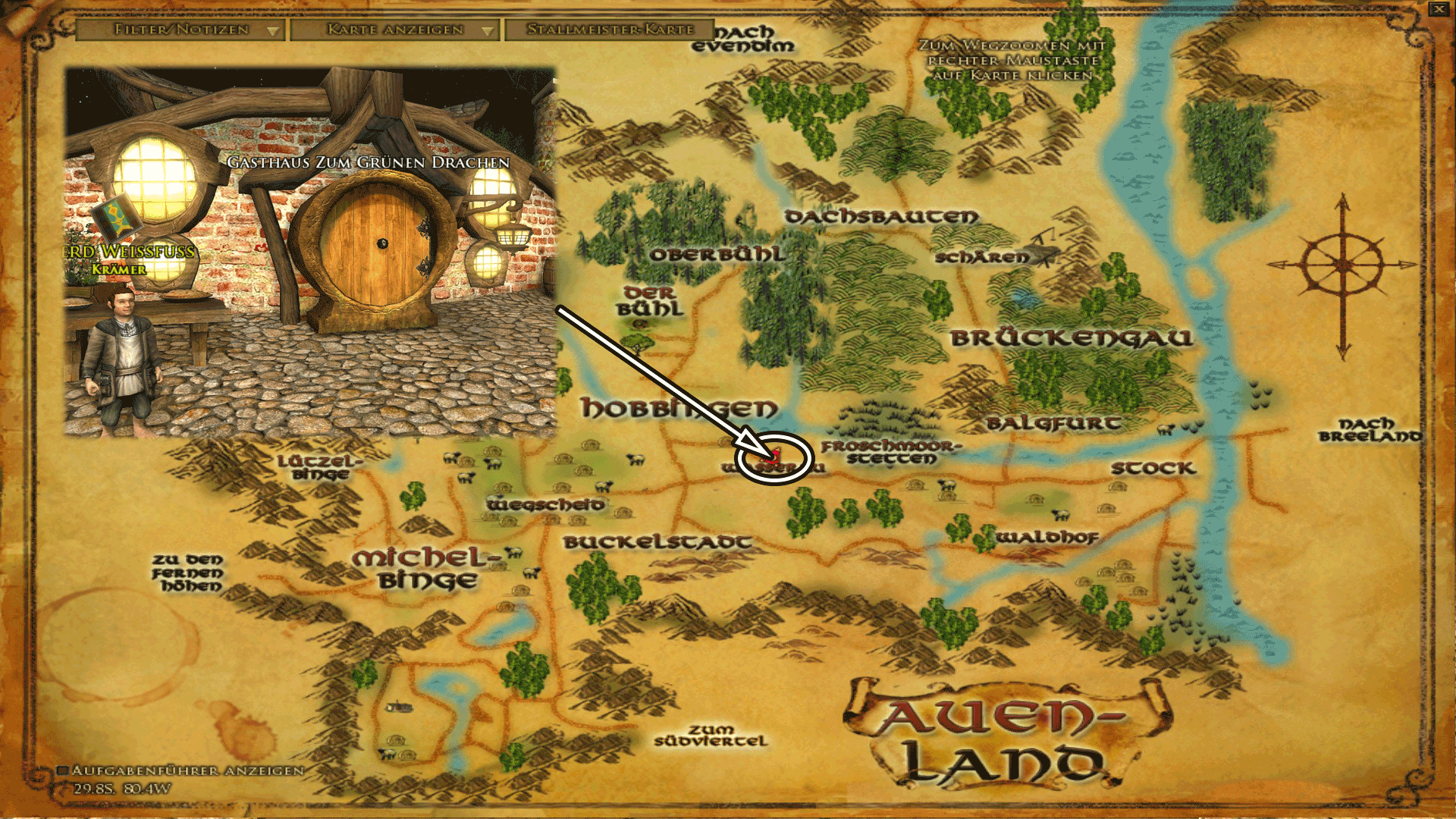Um dieses Gasthaus aufzusuchen müsst ihr euch nach Ered Luin begeben, genauer gesagt in Thorins Halle 13.8S 103.2W, in diesem Gasthaus könnt ihr 2 Erinnerungen finden