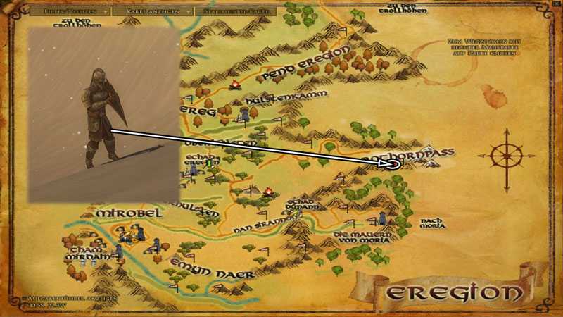 Ihr müsst nun nach Eregion zum Rothordpass. Reist dazu am besten über Bruchtal nach Echad Dunann. Oder nimmt eine alternative [ Reiseroute ] dort hin