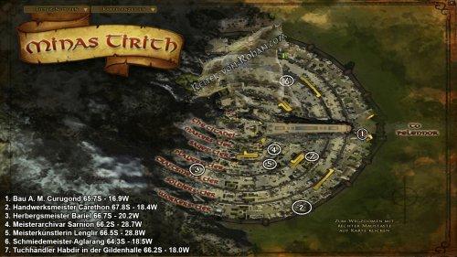 Auch diverse Meister wollen in Minas Tirith gefunden werden. Ich weiß ihr habt sicherlich bereits echt die Schnauze voll. Aber es nützt ja leider nichts. Zum Glück aber gibt es den Thali der euch ein wenig unter die Arme greift. Unten auf meiner Karte sind alle eingezeichnet wo sich diese Befinden.