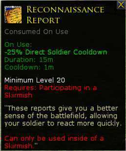 „Aufklärungsberichte“ enthalten eine ausführliche Analyse des Kampfbereichs und ermöglichen es Kommandeuren so, den Kampfverlauf effektiver zu planen. Die Aufklärungsberichte verringern die Abklingzeit der Fertigkeit „Soldat befehligen“ 15 Minuten lang um 25 %. Dieses Verbrauchsgut gibt es ausschließlich im HdRO-Shop.