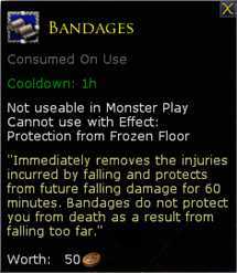 Die Verwendung eines Verbands entfernt verlangsamende Verletzungen durchs Fallen und bietet 60 Minuten lang Immunität gegen diese. Denkt jedoch daran, dass die Verbände keine Wirkung auf die Beschädigung von Gegenständen durchs Fallen bieten. Sie schützen auch nicht vor dem Tod durch zu tiefes Fallen. Dieses Verbrauchsgut gibt es ausschließlich im HdRO-Shop.