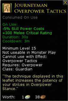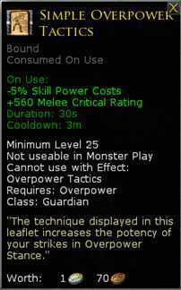 Überwältigungstaktik verringert die Kosten der Nahkampf-Fertigkeiten und erhöht den Wert für kritische Treffer während „Überwältigen“ 30 Sekunden lang. Das „Überwältigungstaktik“-Merkblatt ist ab Stufe 15 erhältlich und bietet alle 5 Stufen eine stärkere Version.