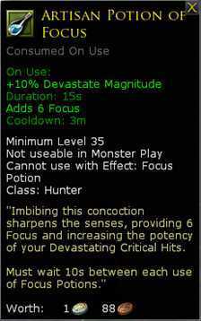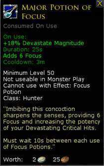 Jäger können nun auf eine kräftige Mischung von Kräutern zugreifen, welche ihre Sinne belebt und ihren Verstand schärft. Diese Tränke geben 7 Fokuspunkte und erhöhen zerstörerisches kritisches Ausmaß 30 Sekunden lang. Diese Tränke sind ab Stufe 15 erhältlich und bieten alle 5 Stufen eine stärkere Version.