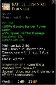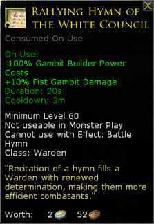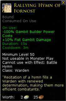 „Schlachtruf-Hymnen“ entfernen die Kraftkosten des Gambit-Aufbaus und erhöhen den Schaden durch alle Faust-Gambits 20 Sekunden lang um 10 %. Schlachtruf-Hymnen sind ab Stufe 25 erhältlich und bieten alle 5 Stufen eine stärkere Version.