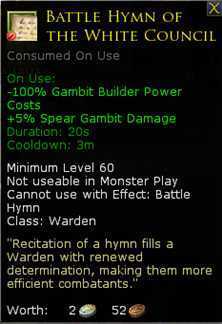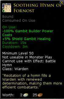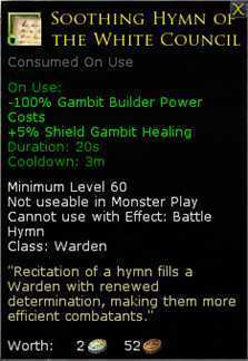 „Besänftigungs-Hymnen“ entfernen die Kraftkosten des Gambit-Aufbaus und erhöhen die Heilung durch alle Schild-Gambits 20 Sekunden lang um 5 %. Besänftigungs-Hymnen sind ab Stufe 25 erhältlich und bieten alle 5 Stufen eine stärkere Version.