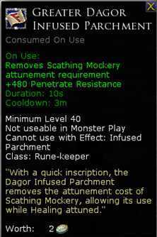 Das „Dagor-Pergament“ entfernt die Einstimmungs-Voraussetzung für „Beißende Verhöhnung“ und ermöglicht es so, diese Fertigkeit auch während der Einstimmung zum Heilen anzuwenden. Diese Pergamente erhöhen auch die Penetration der Runenbewahrerzauber und erhöhen so die Chance, die Verteidigung des Ziels zu durchbrechen. Dagor-Pergamente sind ab Stufe 25 erhältlich und bieten alle 5 Stufen eine stärkere Version.