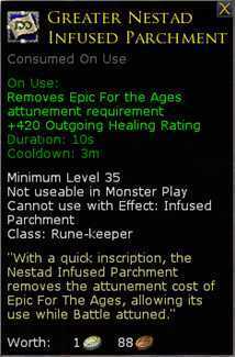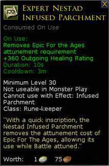 Das „Nestad-Pergament“ entfernt die Einstimmungs-Voraussetzung für „Epos für die Ewigkeit“ und ermöglicht es so, diese Fertigkeit auch während der Einstimmung zum Kämpfen anzuwenden. Diese Pergamente erhöhen auch die taktische Heilung der Runenbewahrer und erhöhen so die allgemeine Effektivität der Heilfertigkeiten von Runenbewahrern. Nestad-Pergamente sind ab Stufe 20 erhältlich und bieten alle 5 Stufen eine stärkere Version.