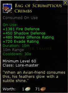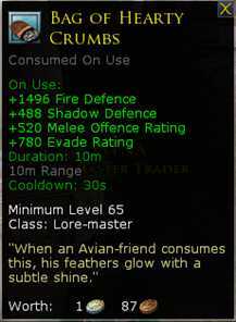 Für den fliegenden Begleiter des Kundigen haben wir den „Beutel Krumen“. Dieses Futter erhöht die Verteidigung gegen Feuer, Schatten, Säure und Frost, den Wert für Nahkampfangriffe und die Ausweichen-Rate 10 Minuten lang. Dieses Futter ist ab Stufe 15 erhältlich und bietet alle 5 Stufen eine stärkere Version.