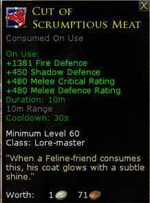 Um den Hunger des Raubkatzenbegleiters der Kundigen zu stillen, gibt es „Portionen Fleisch“. Dieses Futter erhöht die Verteidigung gegen Feuer, Schatten, Säure und Frost, den Wert für Nahkampfverteidigung und den Wert für kritische Treffer (Nahkampf) 10 Minuten lang. Dieses Futter ist ab Stufe 35 erhältlich und bietet alle 5 Stufen eine stärkere Version.