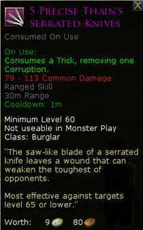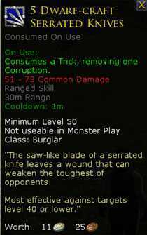 Diese mächtigen Klingen sind ideal dazu geeignet, die Entschlossenheit eines kräftigen Feindes zu schwächen. Wenn die Messer auf ein Ziel geworfen werden, das derzeit einem Schurken-Trick unterliegt, entfernt das gezackte Messer eine Verderbtheit, indem es den Trick verbraucht. Es ist immer ratsam, Messer der höchsten Stufe mit sich zu tragen, denn sie sind gegen Ziele der eigenen oder einer niedrigeren Stufe am wirkungsvollsten.