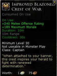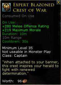 Indem sie ihre Banner mit einem „Geprägten Wappen des Sieges“ verzieren, können Hauptleute ihre Herolds inspirieren und so zu einem effektiveren Tank machen. Dieses Verbrauchsgut ermöglicht es Herolden, effektiver Bedrohung zu erzeugen und ihren Moral-Höchstwert 10 Minuten lang zu erhöhen.