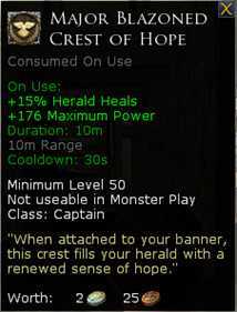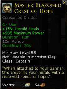 Indem sie ihre Banner mit einem „Geprägten Wappen der Hoffnung“ verzieren, können Hauptleute ihre Herolds ermutigen und sie so zu effektiveren Heilern machen. Dieses Verbrauchsgut verleiht eine Stärkung, die den Wert für Heilung anderer und den Kraft-Höchstwert 10 Minuten lang erhöht.