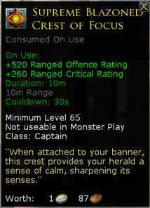 Indem sie ihre Banner mit einem „Geprägten Wappen des Fokus“ verzieren, können Hauptleute die Sinne ihrer Herolds verbessern und sie so zu effektiveren Fernkämpfern machen. Dieses Verbrauchsgut verleiht eine Stärkung, die den Wert für Fernkampfangriffe und den Wert für kritische Fernkampftreffer 10 Minuten lang erhöht.